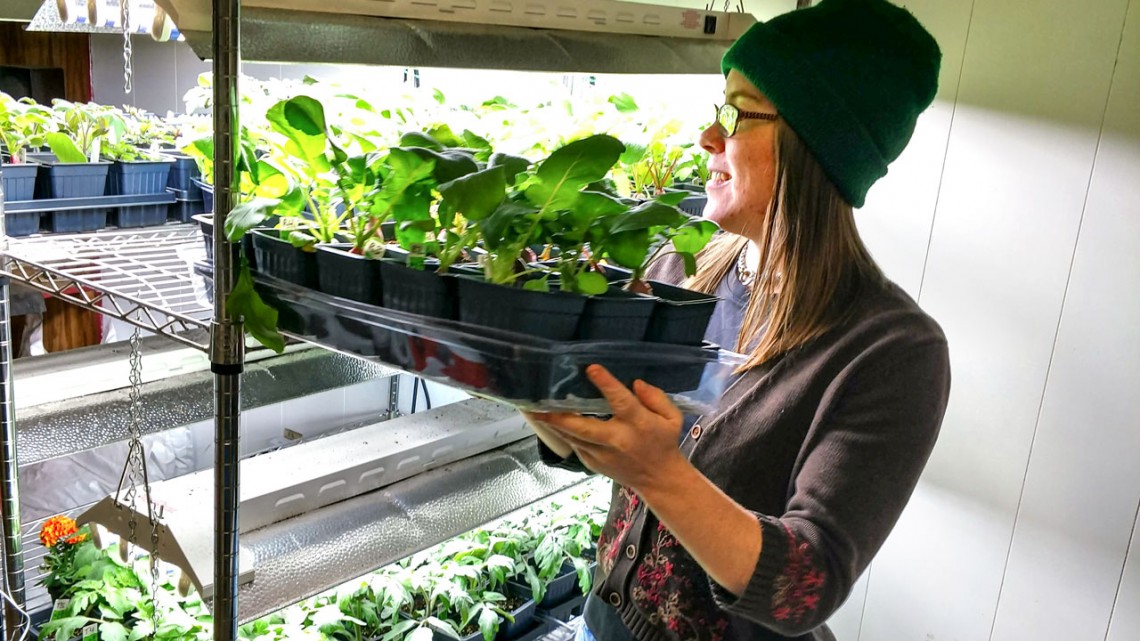 Soil scientist Margaret Ball M.S. ‘16, of Bio365, tends to plants grown in the biochar made from manure.