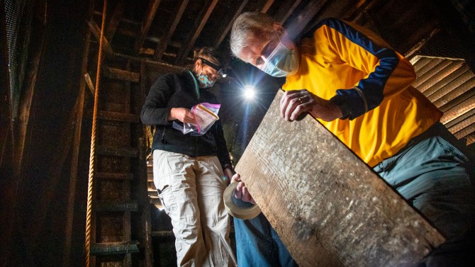 Brita Lorentzen ’06, Ph.D. ’15 (left), research associate and manager of the Cornell Tree-Ring Laboratory, and Sturt Manning, Distinguished Professor of Arts and Sciences in Classical Archaeology in the College of Arts and Sciences, examine wood in the belfry of St. James A.M.E. Zion Church in Ithaca.