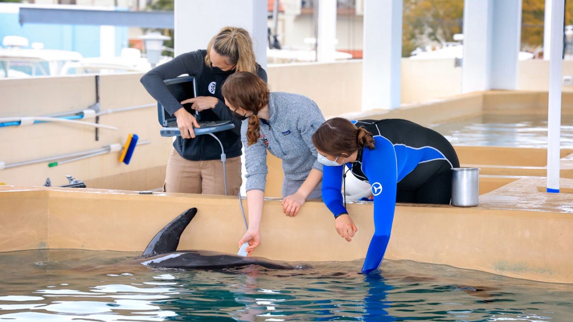 Michelle Greenfield, D.V.M. '23, center, performs an ultrasound on a dolphin at Clearwater Marine Aquarium with guidance from Aquarium staff.
