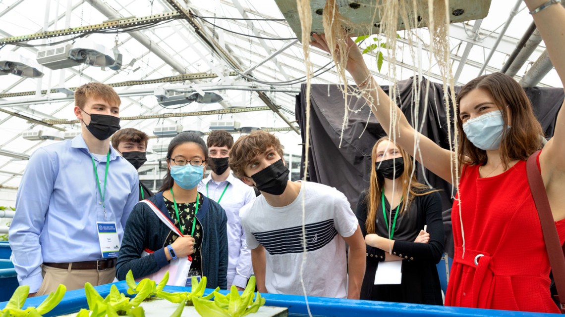 Francine Barchett MPS ’21 Ph.D. ’24, far right, and Joseph Tornabene, middle, a student at Clean Technologies & Sustainable Industries Early College High School, inspect an aquaponic system at the Kenneth Post Laboratory greenhouses.