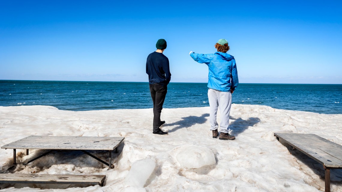 Cornell Surf Club co-founders Will Taber ’22, left, and Ben Collins ’22 survey the conditions of Lake Ontario.