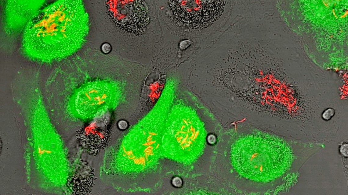 The fluorescence micrograph shows human macrophages that are experimentally infected with both HIV-1 (that expresses green fluorescent protein) and Mycobacterium tuberculosis (that expresses mCherry fluorescent protein). Macrophages support the growth of both infectious agents.