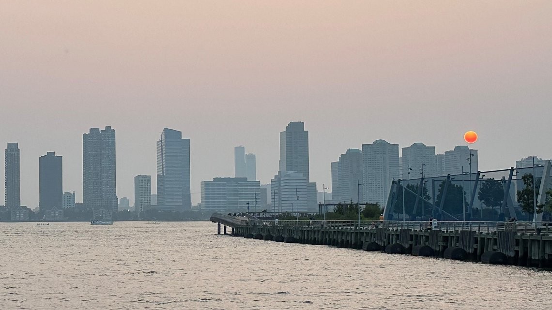 The setting sun over Hoboken, NJ across the Hudson River seen from Lower Manhattan during the wildfire smoke event summer 2023.