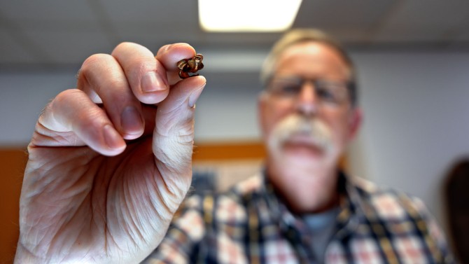 Kevin Hynes, head of the New York State Department of Environmental Conservation’s Wildlife Health Program, holds what remains of a copper-jacketed lead bullet recovered from a deer. The petaled copper jacket is intact, but the lead core fragmented inside the animal.