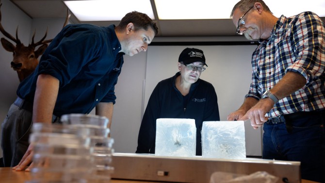 At the New York State Department of Environmental Conservation’s Wildlife Resources Center in Delmar, New York, from left to right, wildlife biologists Matthew Palumbo, Kelly Stang and Kevin Hynes compare ballistic gels displaying the difference between lead and copper bullets.