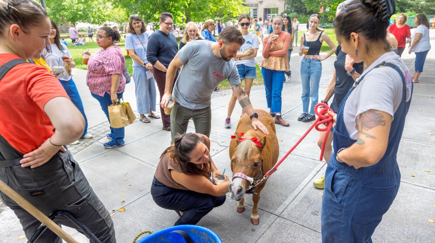 The afternoon included lawn games and music performances by Jim Sheridan, Cornell retiree; Beth Korson, CLASP program coordinator; and Jeremy Faulk, doctoral researcher. Participants had free iced coffee courtesy of Gimme Coffee, browsed Hortus Forum’s plant sale and even visited with Minnie, the College of Veterinary Medicine’s miniature horse.