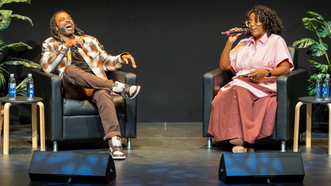 Actor Daveed Diggs, left, speaks with Samantha Sheppard, chair and associate professor of performing and media arts, Sept. 25 at the Schwartz Center.