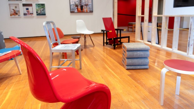 “Seeing these collections together opens fresh ways of thinking about materiality, place and familial relationships,” says Annie Abernathy, the museum’s curatorial assistant and the lead coordinator for the show. “Visitors can see artworks with new perspectives alongside pieces from CHE’s Cornell Fashion + Textile Collection and iconic design chairs they can sit in and experience. Thanks to the creativity of both the CHE’s design team and the museum’s staff, the gallery becomes a kind of home itself, to experiment and ponder within.”