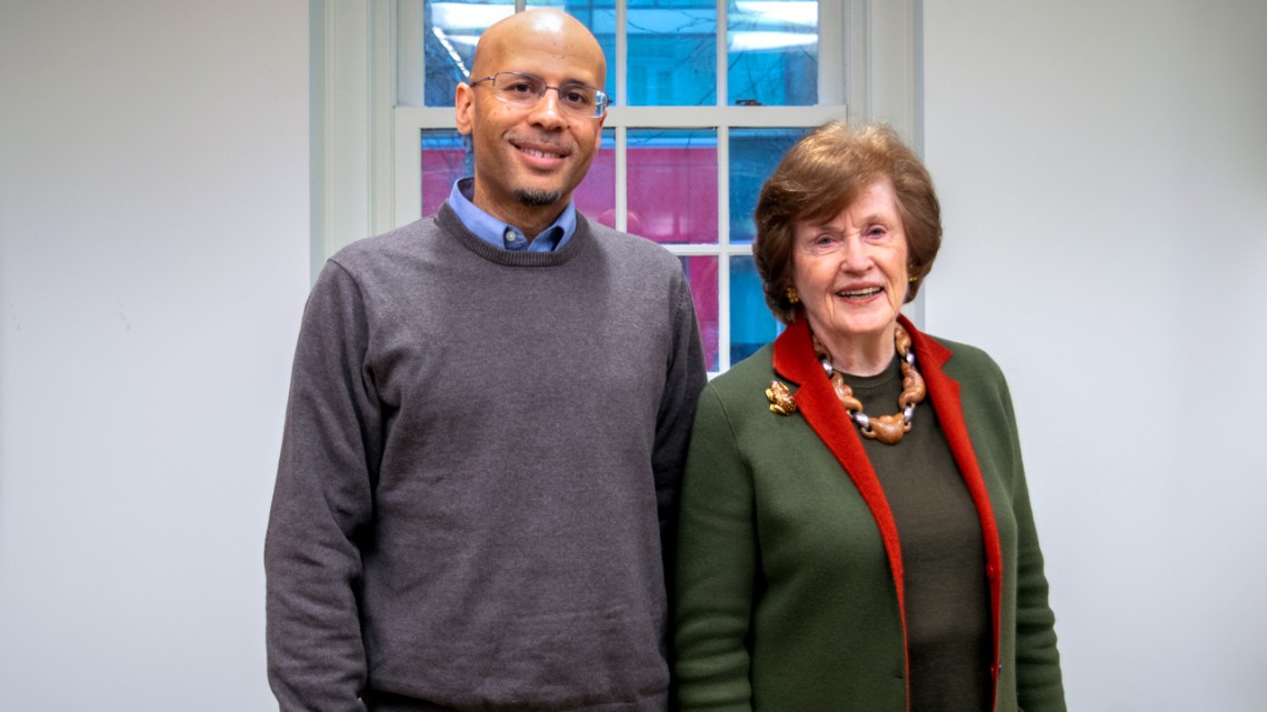 Anthony Burrow, director of the Bronfenbrenner Center for Translational Research, meets with Becky Morgan ’60.