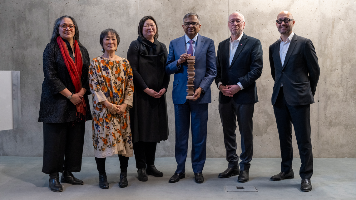 The evening's speakers (from left): Neema Kudva, City and Regional Planning Professor and Senior Associate Dean for Academic Affairs; Billie Tsien, AIA; J. Meejin Yoon, Gale and Ira Drukier Dean of The College of Architecture, Art, and Planning; Natarajan Chandrasekaran, Chairman of Tata Sons; Michael I. Kotlikoff, President of Cornell University; and Jose Castillo, Professor and Chair of the Department of Architecture.
