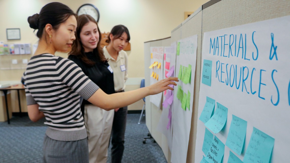 CUSD Sustainable City team members Isabella Zhi ’24 (left), Madeline Richmond, M.Eng. ’23 and Yuxi Wei, M.Eng. ’23 review notes at a March 2023 workshop at Tompkins County Public Library that brought together key stakeholders for the LEED certification project.