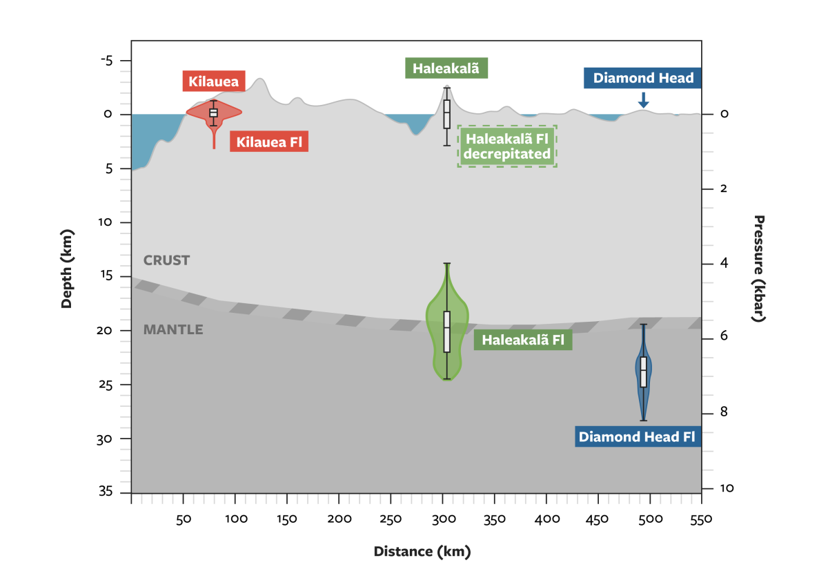 - Haleakala, in the post-shield stage, revealed dual storage zones: one shallow at approximately 2 kilometers and one deep at 20–27 kilometers in the Earth’s mantle; and