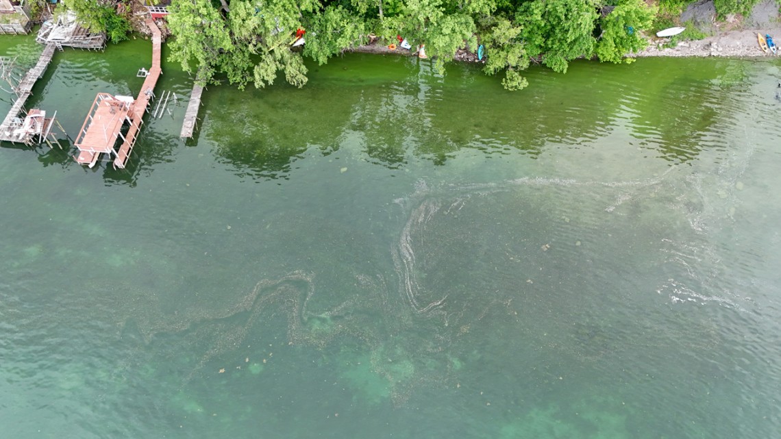 A harmful algae bloom along the west shore of Cayuga Lake.