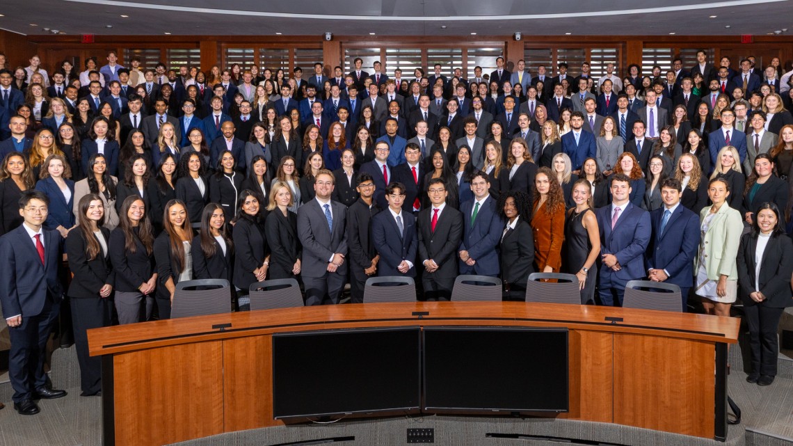 Geographically, the class is diverse, with students representing 34 states, the District of Columbia, and eight countries, including Canada, China, Hungary, India, Kazakhstan, Nigeria, Singapore, and South Korea. States with the highest representation include New York (41 students), California (32), New Jersey (20), and Florida (14). Their undergraduate backgrounds are equally varied, with students coming from 108 different institutions. Notable clusters include Cornell (26 students), NYU (10), Columbia (5), and UC Berkeley/UCLA/Univ. of Illinois (5 each). Additionally, 15 percent are first-generation college students, and 4 percent are veterans or military reservists.