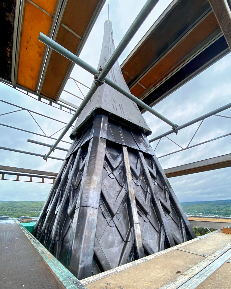 The most time-consuming part of the project, Ladley said, was the removal and careful replacement of the roof’s lead-coated copper sheets, soldered pans and wood decking that form its pyramidal shape.