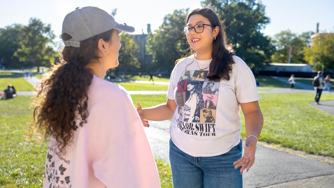 Swift Club Vice President Agustina Garcia ’27 (right) and Taylor Swift fan Leyla Rivera '27 prepare for the club's "The Life of a Showgirl" album release party starting at 10 p.m. Oct. 2 in Willard Straight Hall Memorial Room.
