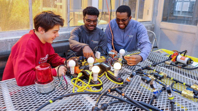 The plant team was led by Tian Gong, a postdoctoral researcher in the lab of Margaret Frank, associate professor in the School of Integrative Plant Science in the College of Agriculture and Life Sciences. She led the team transplanting the exemplar plants from a bespoke bucket system into commercially available hydroponic rockwool, and labeling and cataloging the collection of test plants into the system. Daniel Baldeo-Thorne, a recent graduate of Cornell who participated in Rev’s Summer Prototyping Hardware Accelerator program, worked with Bobby Henkelmann, an undergraduate student in the School of Electrical and Computer Engineering and a member of the Cornell Autonomous Underwater Vehicle project, on the wiring and programmable microelectronics that actuate the pumps and valves of the hydroponic fertigation system.