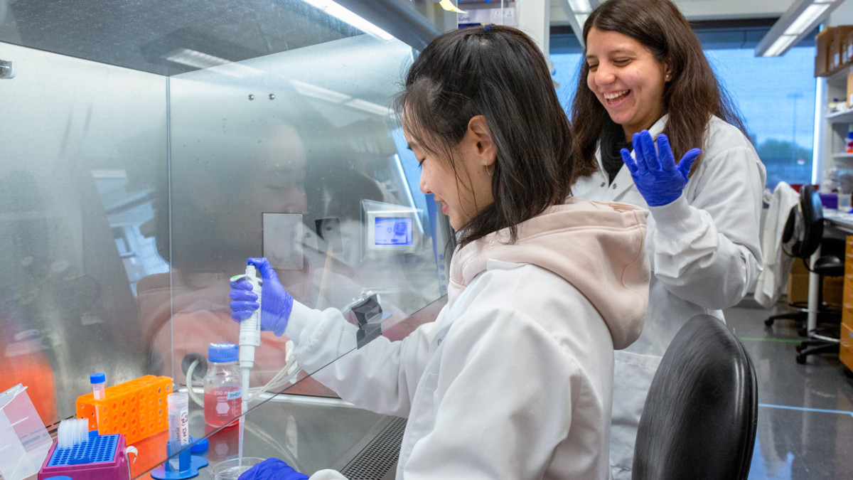 Yiwei Yan ’25 (left) researched breast cancer cell growth as an undergraduate working in a biomedical engineering lab.