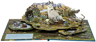 The book's seven elaborately engineered, full-color pop-ups depict dozens of bird species in North American habitats, such as grasslands, the Sonoran desert, an eastern deciduous forest, a pacific seabird colony, the arctic tundra and a cypress swamp.