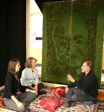 Where the light hit the grass, it stayed green. The grass that did not receive light withered, forming the image. When the darkroom curtains came down unveiling the work, Hadekel and Eames-Sheavly furnished the space with a rug and cushions, creating an inviting, contemplative space for students in front of the portrait.