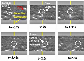 As a demonstration, graduate students Allen Yang, Sean Moore, Bradley Schmidt and colleagues in Erickson's and Lipson's research groups laid a slot waveguide across a microscopic fluid channel and showed that light from an infrared laser channeled through the wave guide could trap 75-nm diameter polystyrene spheres and comparably-sized DNA molecules out of a stream of water flowing across it. The light in the slot waveguide extends above the slot and exerts a downward force on a particle entering it, pulling the particle down into the slot. Since light pressure then moves the trapped particles along the slot, such a device could be used to separate biological molecules out of a stream and send them somewhere else for processing, the researchers said. Further development, they added, could make it possible to separate DNA molecules by length for rapid DNA sequencing.