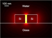 So they turned to a new device created by Lipson: a "slot waveguide" -- two parallel silicon bars 60 nm apart, serving as two parallel wave guides. Light waves traveling along each guide expand beyond its boundaries, but because the parallel guides are so close together, the waves overlap and most of the energy is concentrated in the slot. In addition to creating a more intense beam, this structure allows a beam of light to be channeled through air or water.