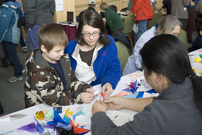 Farther down the hall, Kevin Ernste, Cornell assistant professor of music and director of the Cornell Electroacoustic Music Center, revealed his digital music-composing and recording software, and Cornell Lab of Ornithology's exhibit allowed children to paint and decorate tiles celebrating urban birds.
