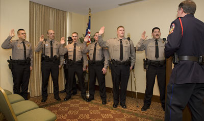 Four new Cornell University Police (CUP) officers -- Christopher Cady, Kyle Hollenbeck, Blair MacDonald and Eric Stickel -- were sworn in and officers Anthony Tostanoski and Scott Salino were promoted to sergeant in a Jan. 14 ceremony in the Taylor Room of the Statler Hotel.
