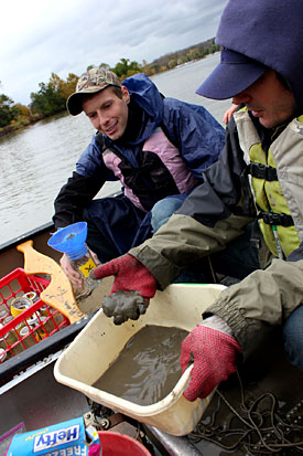 The class also has access to equipment and expertise on campus to help them gather and analyze data. For one lab session, students went through the inlet in boats and canoes to map the depth of sediment using sonar, take sediment samples for physical and chemical analysis, and measure how far light penetrates into the water to predict aquatic plant habitat. This year's project has been complicated by the August discovery of Hydrilla verticillata, an invasive aquatic weed, at several locations around the inlet. Any options suggested by the class can't increase the weed's spread, Whitlow points out. The class is conducting tests to see how drying out the plant affects its ability to survive.