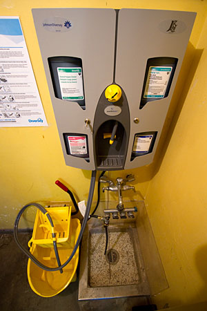 Each dispenser contains concentrates of floor, window and bathroom cleaners and a degreaser. With the turn of a knob, the selected product is dispensed through a hose and nozzle, precisely diluted with tap water.