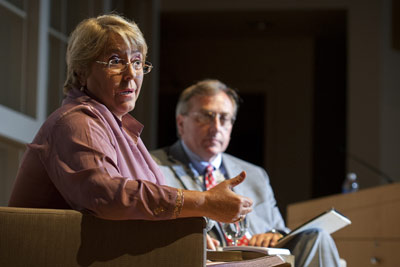 In her introduction, Bachelet noted the groundbreaking work of Cornell on the empowerment of women. Citing the first woman to matriculate at Cornell, Jennie Spencer, Class of 1870, who graduated 50 years before American women had the right to vote, Bachelet said: "She was literally taking an historic step forward."