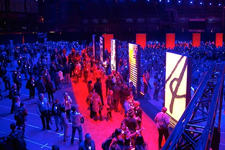 A huge, square red carpet in the center of the hall held the largest staging area, which was surrounded by 12-foot-high vertical, illuminated displays of images ranging from a close-up of a mosquito ear, to President Abraham Lincoln’s signature, to a map detailing restaurant spending in the New York City metro area. Performers were projected onto huge screens hung from scaffolding.
