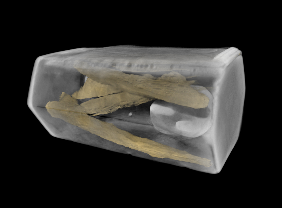 After initial CT scans by Micro Photonics staff, Riccio also helped to image inside the small silver box. “Scanning the silver box was very difficult because silver is dense and one of the artifacts inside was made of lead,” said Riccio. But he created new protocols to capture the contents in 3-D. The box then traveled to General Electric for even higher energy CT scans.