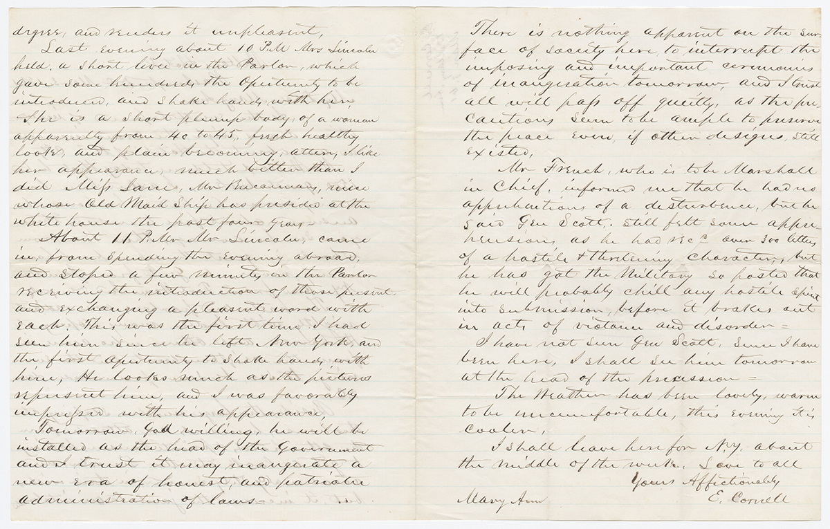 Written in straightforward prose, the letter offers an unusually intimate glimpse of a pivotal moment. Cornell’s assessment of Mary Lincoln is unsparing but kind, mentioning her “short plump body,” “fresh healthy look” and “plain becoming attire.” For a fuller portrait, visitors can read the following day’s entry in Cornell’s diary, also on view, in which he recounts marching with the New York delegation and hearing Lincoln’s “forcibly” delivered inauguration speech.