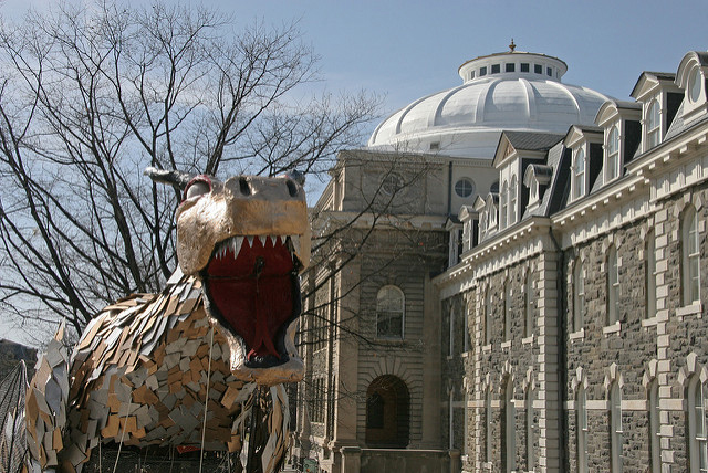 John Hartell Gallery in Sibley Dome is hosting an exhibition celebrating this history, “Heads of the Hydra: Trophies of Dragon Day,” showcasing photographs and artifacts of Dragon Days past including T-shirts and the heads of the dragons themselves.
