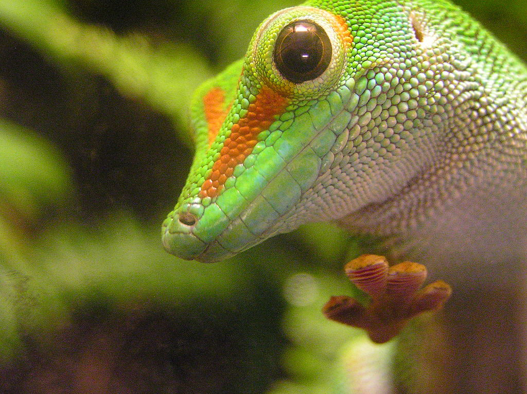 Geckos climb vertically up trees, walls and even windows, thanks to pads on the digits of their feet that employ a huge number of tiny bristles and hooks.
